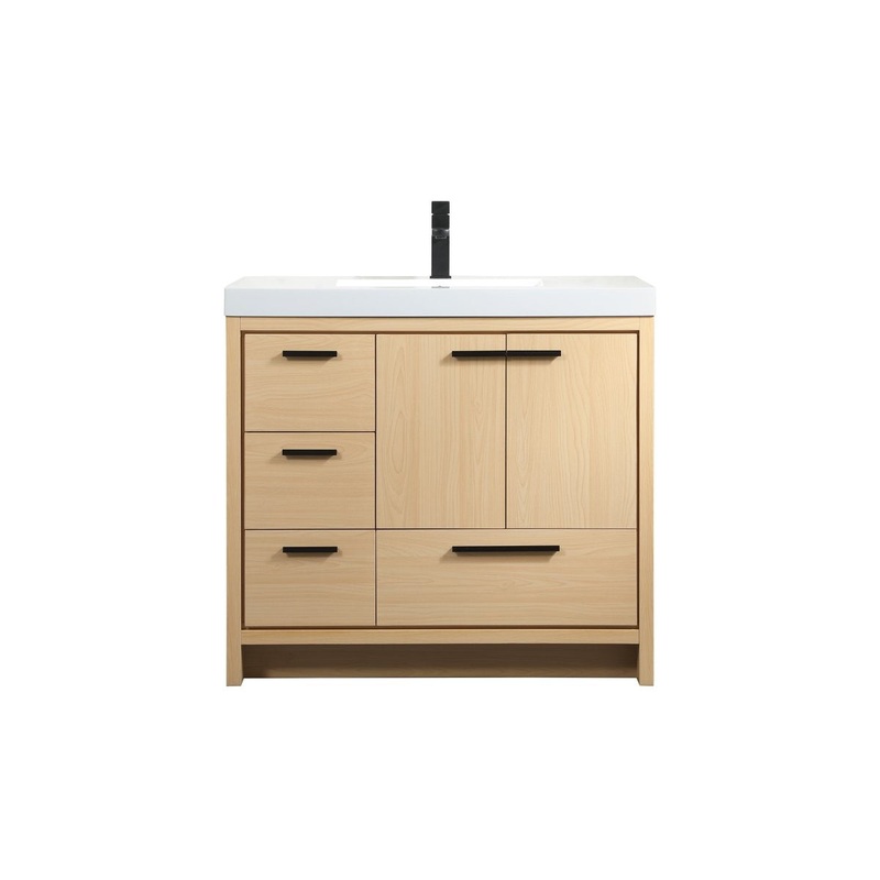 Modern sophistication is defined within the maple finish and black barpulls of this vanity. Its length makes it the perfect addition to any sized home, and saves space with its storage area hidden behind the double cabinet doors and one bottom drawers. Topped with a highly durable resin white counter top and an integrated sink, this modern design will add everlasting class to your bathroom and powder room.