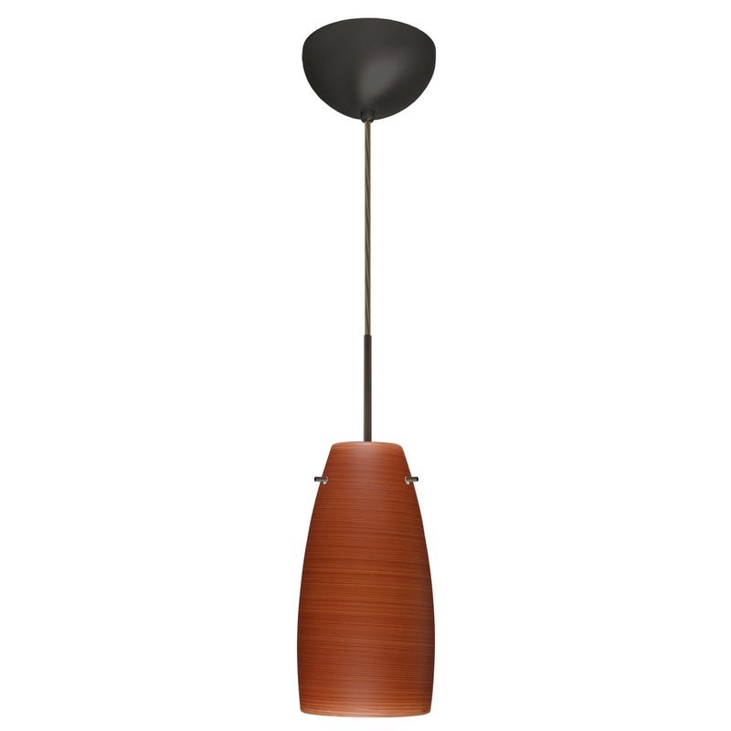 The Tao 10 pendant features a softly radiused glass, that will gracefully blend into almost any decorating theme. Our Cherry glass is a soft off-white cased glass that is handcrafted with spiraling strokes of dark red, emphasizing the subtle brush pattern. The reddish rippled design is subdued and harmonious. Unlit, it appears as simply a textured surface like wood grain, but when lit the texture comes alive. The smooth satin finish on the clear outer layer is a result of an extensive etching process, with the texture of the subtle brushing. This blown glass is handcrafted by a skilled artisan, utilizing century-old techniques passed down from generation to generation. The cord pendant fixture is equipped with a 10′ SVT cord set and an “Easy Install” dome monopoint canopy. These stylish and functional luminaries are offered in a beautiful brushed Bronze finish.
