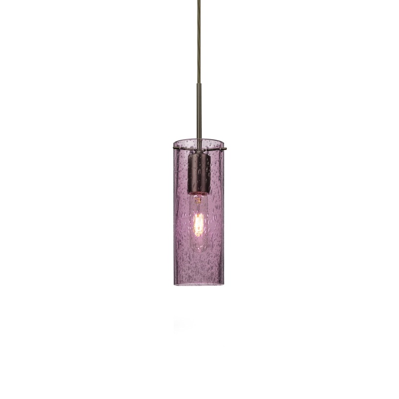 Product Description:The Juni 10 Pendant is composed of a transparent Plum glass cylinder, with an interesting bubble pattern blown randomly throughout the glass. The pleasing play of light through the bubble accents make for a striking affect, along with t