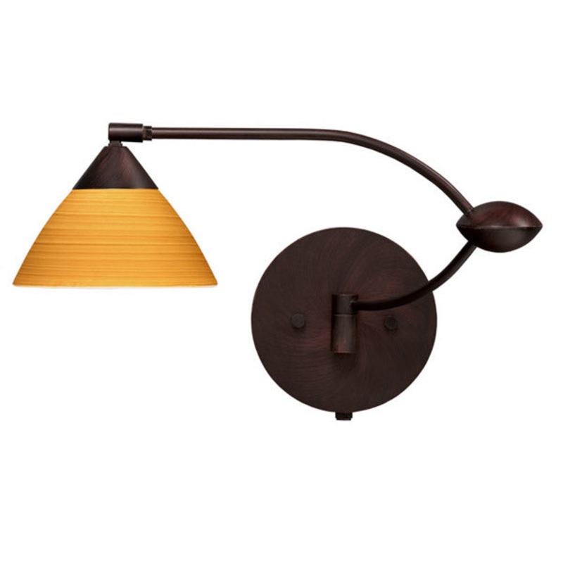 Domi has a classical bell shape that complements aesthetic, while also built for optimal illumination. Our Oak glass is a soft off-white cased glass that is handcrafted with spiraling strokes of light brown, emphasizing the subtle brush pattern. The wood-toned rippled design is subdued and harmonious. Unlit, it appears as simply a textured surface like wood grain, but when lit the texture comes alive. The smooth satin finish on the clear outer layer is a result of an extensive etching process, with the texture of the subtle brushing. This blown glass is handcrafted by a skilled artisan, utilizing century-old techniques passed down from generation to generation. The swingarm fixture includes a 12V electronic transformer and integrated full-range rotary dimmer. The adjustable arm assembly allows for 155 degree rotation and pivots at the clamshell-shaped center connection. These stylish and functional luminaries are offered in a beautiful brushed Bronze finish.