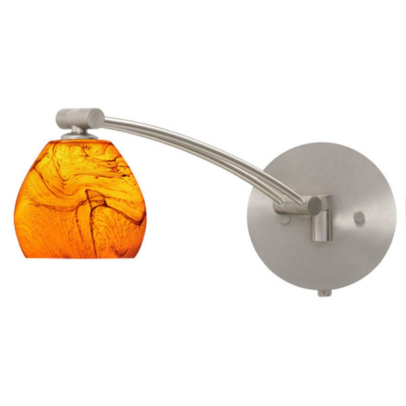 The Tay Tay is a compact handcrafted glass, softly radiused to fit gracefully into contemporary spaces. Our Habanero glass is a warm toned cased glass, with inner opal and a glossy finish. The color of vibrant Persimmon is accented by flowing marbleized black lines, and nestled between the inner opal and outer clear layers. When lit the glass is vitalizing as well as stylish, that adds appeal to any environment. This blown glass is handcrafted by a skilled artisan, utilizing century-old techniques passed down from generation to generation. Each piece of this dcor has its own artistic nature that can be individually appreciated. The swingarm fixture includes a 12V electronic transformer and integrated full-range rotary dimmer. The adjustable arm assembly pivots for 130 degree rotation at the canopy, and swings up and down within 180 degree range. These stylish and functional luminaries are offered in a beautiful Satin Nickel finish.