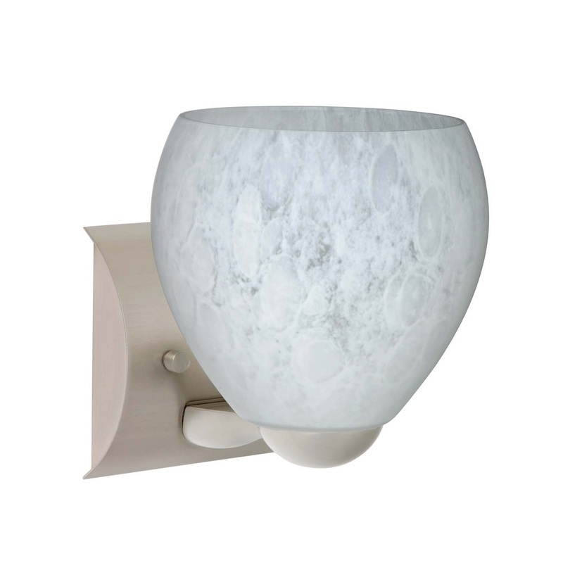 The Bolla is a compact handcrafted glass, softly radiused to fit gracefully into contemporary spaces. Our Carrera glass is a classic yet modern dcor that gives off a soft white light. Clear molten glass is rolled in alabaster powder like frit, and then blown into shape with a semi-clear frosted white inner finish. This dcor is created by rolling molten glass in small bits of white called frit. The smooth satin finish on the clear outer layer is a result of an extensive etching process. This blown glass is handcrafted by a skilled artisan, utilizing century-old techniques passed down from generation to generation. Each piece of this dcor has its own artistic nature that can be individually appreciated. The mini sconce fixture is equipped with a sleek arcing die cast lamp holder and matching radiused rectangular canopy. These stylish and functional luminaries are offered in a beautiful Satin Nickel finish.