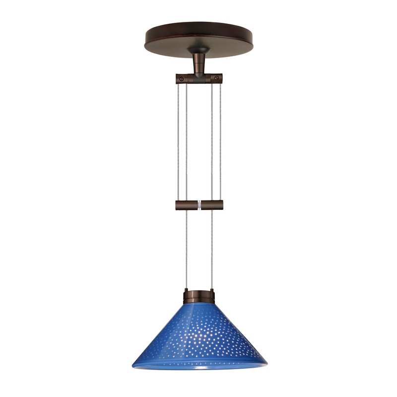 The Kona pendant features a wide cone-shaped glass, that demonstrates contemporary sensibilities. Our Blue Starpoint glass is pressed glass that features small points of clear that project from the blue outer and white inner finish, creating a star-light effect. When lit the glass is vitalizing as well as stylish. The gleaming color can accent any modern or classic dcor. This handcrafted glass uses a process where every glass is consistently produced using a press mold, keeping variations to a minimum. The 12V adjustable pendant fixture is equipped with 8′ of bare silver-color braided cable, spring-loaded cable adjuster, quick connect jack and low profile flat monopoint canopy. These stylish and functional luminaries are offered in a beautiful brushed Bronze finish.