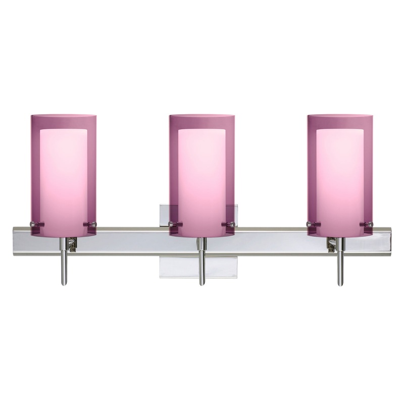 The Pahu is a distinctive double-glass pendant, with an inner opal cylinder centered within a transparent outer glass. Our Trans-Amethyst colored blown glass complements the soft white Opal cased glass, which can suit any classic or modern decor. Opal has a very tranquil glow that is pleasing in appearance, as the Trans-Amethyst glass sparkles with the accents from that glow. The smooth satin finish on the opals outer layer is a result of an extensive etching process. This blown glass combination is handcrafted by a skilled artisan, utilizing century-old techniques passed down from generation to generation. The vanity fixture is equipped with decorative lamp holders, removable finials, linear rectangular housing, and a removable low profile oval canopy cover. These stylish and functional luminaries are offered in a beautiful Chrome finish.