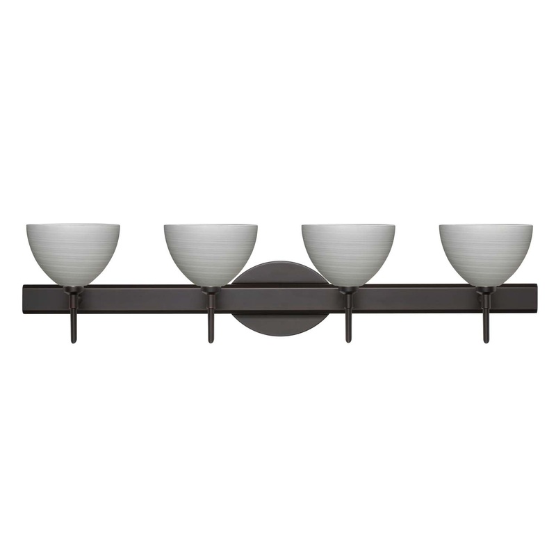 Brella has a classical bell shape that complements aesthetic, while also built for optimal illumination. Our Titan glass is a soft off-white cased glass that is handcrafted with spiraling strokes of silver, emphasizing the subtle brush pattern. The silvery rippled design is subdued and harmonious. Unlit, it appears as simply a textured surface like spun silk, but when lit the texture comes alive. The smooth satin finish on the clear outer layer is a result of an extensive etching process, with the texture of the subtle brushing. This blown glass is handcrafted by a skilled artisan, utilizing century-old techniques passed down from generation to generation. The vanity fixture is equipped with decorative lamp holders, removable finials, linear rectangular housing, and a removable low profile oval canopy cover. These stylish and functional luminaries are offered in a beautiful brushed Bronze finish.