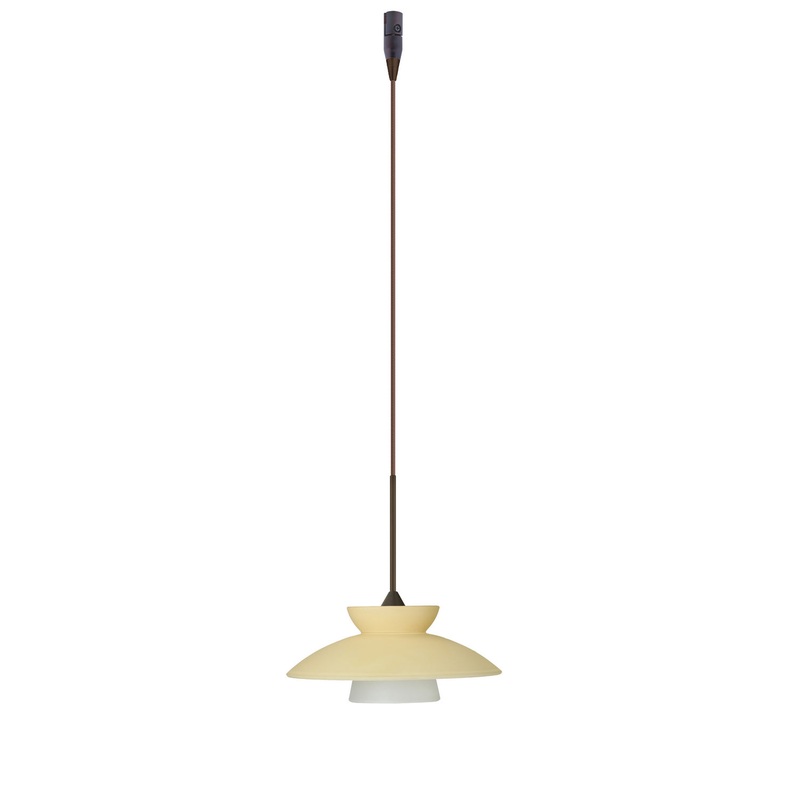 Trilo 7 is comprised of three complementary glass segments, resulting in a playful glass display. Our Champagne glass is a light yellow pressed glass, with a white inner layer. When lit this gives off a light that is functional and soothing. Champagne is a pleasing neutral color that suits almost any dcor. The smooth satin finish on the clear outer layer is a result of an extensive etching process. This handcrafted glass uses a process where every glass is consistently produced using a press mold, keeping variations to a minimum. The 12V cord pendant fixture is equipped with a 10′ coaxial cord set with Teflon jacket, quick connect jack and a Besa Rail Adapter. These stylish and functional luminaries are offered in a beautiful brushed Bronze finish.