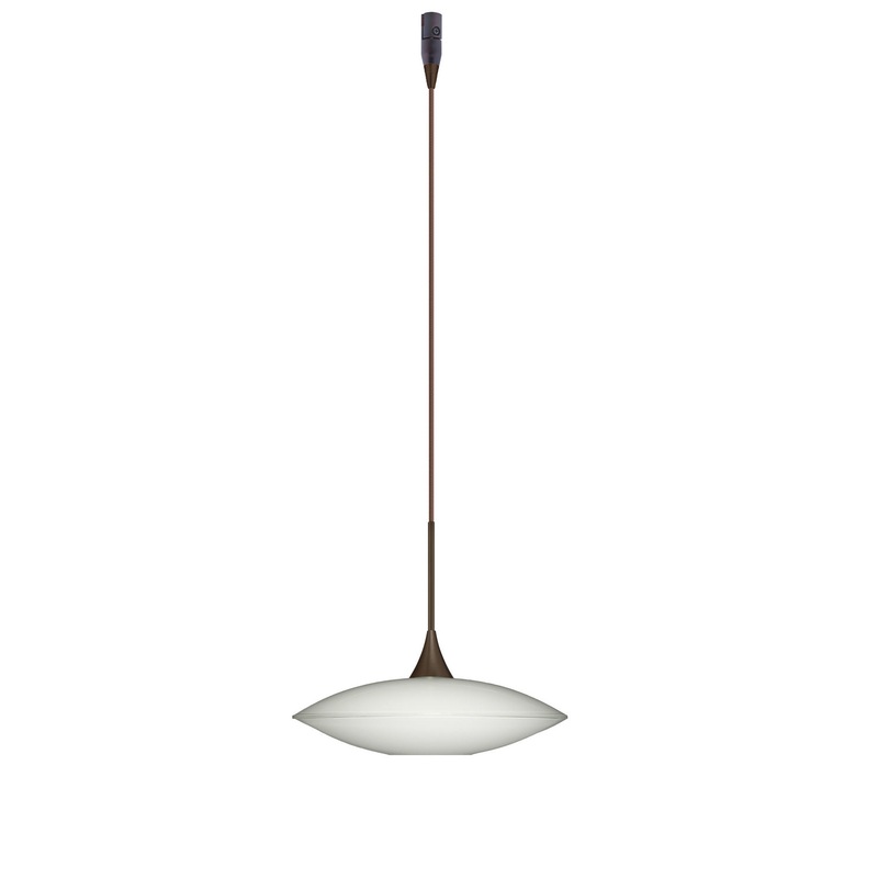 The Spazio pendant features two softly radiused glasses, fused together to create a refined contemporary look. Our Opal Glossy glass is a opal cased glass with a contemporary polished finish and opal inner layer. The tranquil glow has a low key harmonious display that exudes a warm mood. When lit the glass is vitalizing as well as stylish. This blown glass is handcrafted by a skilled artisan, utilizing century-old techniques passed down from generation to generation. The 12V cord pendant fixture is equipped with a 10′ coaxial cord set with Teflon jacket, quick connect jack and a Besa Rail Adapter. These stylish and functional luminaries are offered in a beautiful brushed Bronze finish.