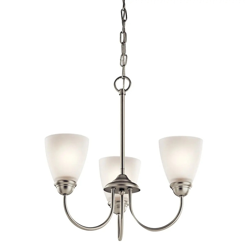 Enjoy the splendor of this Brushed Nickel 3 light LED mini chandelier from the refreshing Jolie Collection. The clean lines are beautifully accented by satin etched glass. Jolie is the perfect transitional style for a variety of homes.