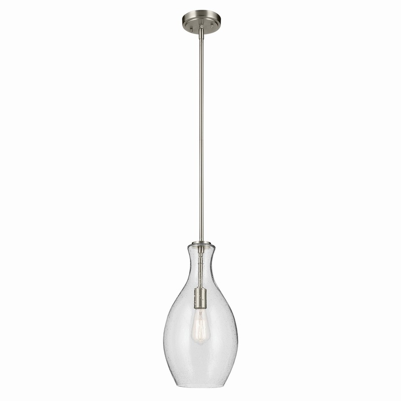 A modern style with minimal detailing, the Everly 1-light pendant easily elevates the style of soft modern environments. This elegant pendant offers a soft, curvilinearform and contemporary, clear seededglass silhouette that provides ambient lighting to the entire room. As beautiful as it is versatile,adjust the hanging height to meet the needs of your space.