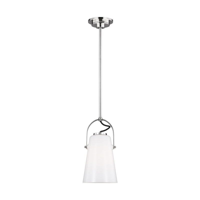 Hazel updates an industrial form with elegant white milk glass. Branded canopy detailing and an exposed fabric black cord creates a refined foundation for modern living The curved metal above the shade draws inspiration from the stirrups on a horse or saddle.