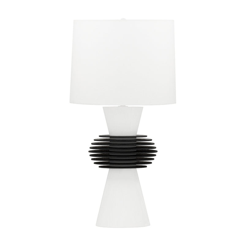 Individual stacked rings of aged iron wrap the body of this gorgeous table lamp. The soft white plaster finish and Belgian linen shade give the fixture a soothing, organic feel. Light is cast both up and down from the classic drum-shaped shade, filling any space with a warm glow.