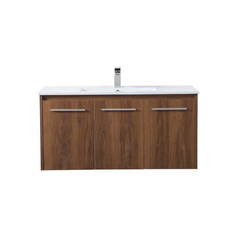 The contemporary simplicity of this 40″ floating vanity in a walnut brown finish will help open the space and add stunning modern flair to your bathroom or powder room. The open space below makes it easy to show off your tiles and to clean the floor with ease–it`s also the perfect place for a hamper. 3 doors open to reveal plentiful of storage pace to store all of your bathroom miscellany. The clean lines that permeate through the design will surely create a fresh look in your home.